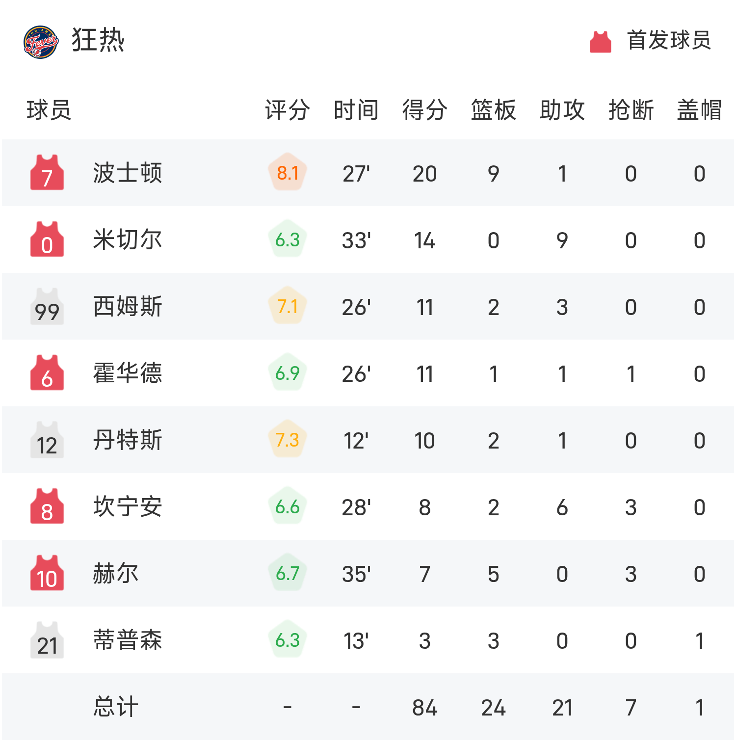 WNBA战报:西特龙21分,波士顿20分9板,神秘人88-84险胜狂热