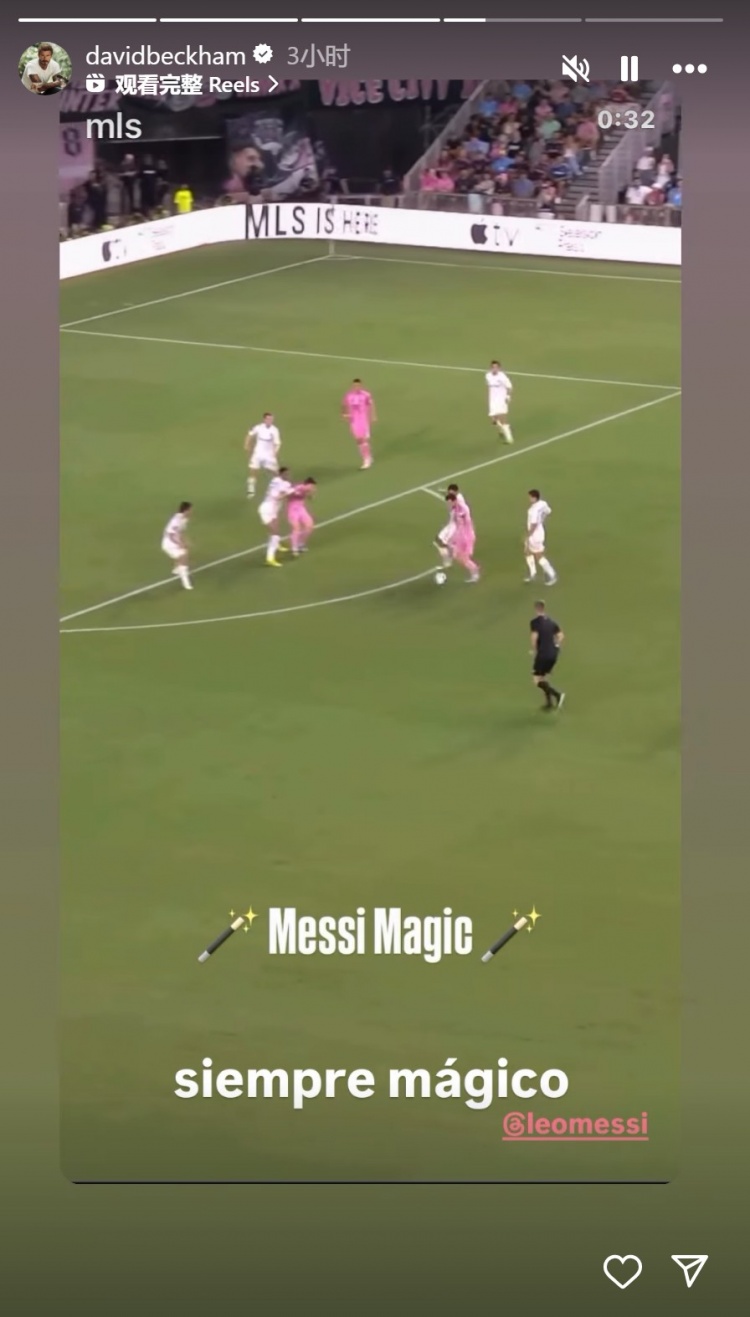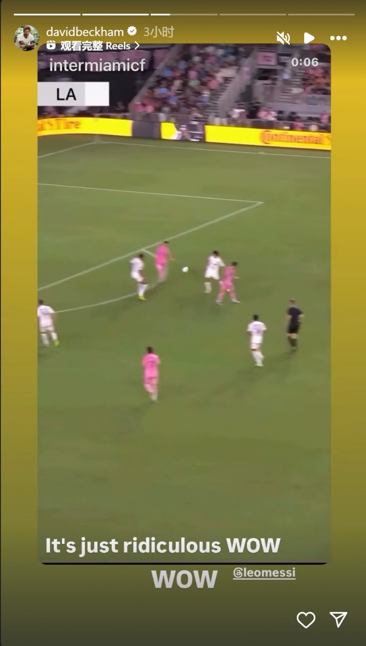球队老板贝克汉姆在社交媒体连发两条动态,先是转发梅西精妙脚后跟助攻视频并感叹:"这太不可思议了,哇哦!"随后又分享梅西标志性远射破门画面,配文称:"梅西的魔法时刻,永远充满神奇。"
